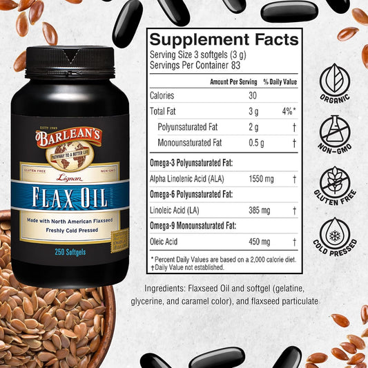 Barlean's Lignan Flaxseed Oil Softgels, Cold-Pressed Flax Seed Supplement with 1,550 mg ALA Omega-3 Fatty Acids for Joint & Heart Health, 1000mg, 250 ct