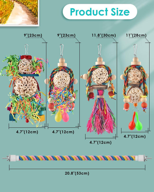 Bissap Conure Toys, 4 PCS Parrot Foraging Shredder Hanging Toys Sola Balls with Sand Hammer Perch Swing Climbing for Small Parrots Parakeets Conures Cockatiels Love Birds Cage Toy