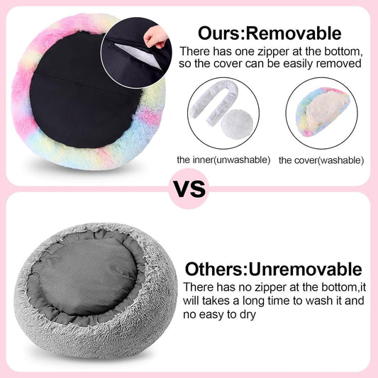 Calming Dog Beds & Cat Cave Bed with Hooded Cover,Removable Washable Round Beds for Small Medium Pets,Anti-Slip Faux Fur Fluffy Coved Bed for Improved Sleep,Fits up to 15/25 lbs(Colorful,S)