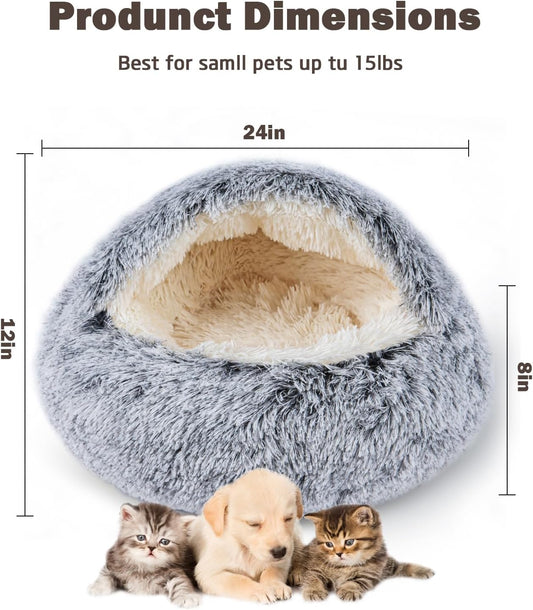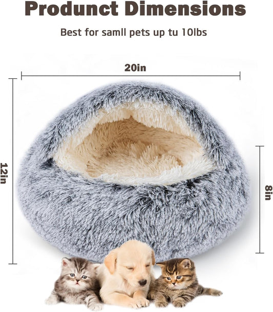 Cat Bed Hooded Plush Nest with Self-Warming Cozy Cave, Calming Anti-Anxiety Pet Bed for Indoor Cats & Small Dogs, Removable Washable Cover & Waterproof Bottom - Gray