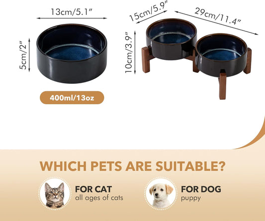 Ceramic 5.1inch Raised Double Bowls Set with Acacia Wood Stand, 2 Heights Elevated, Food & Water Bowls for Puppy, Kitty, Cats(13.5oz, Starry Sky)