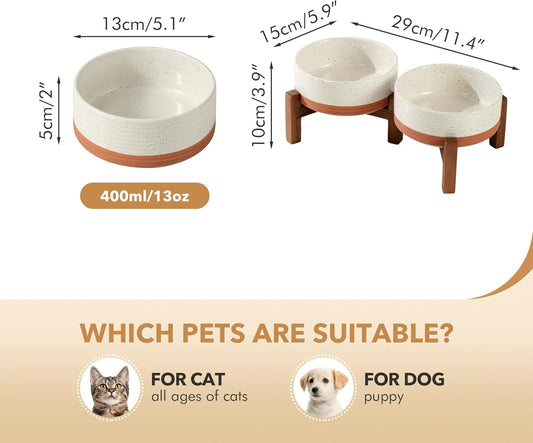 Ceramic 5.1inch Raised Dog and Cat Bowl Set, 2 Heights Elevated Wooden Stand for Puppy, Kitty, Cats, Weighted Pet Food and Water Dishes(5.1'',13.5oz, Vanilla White)