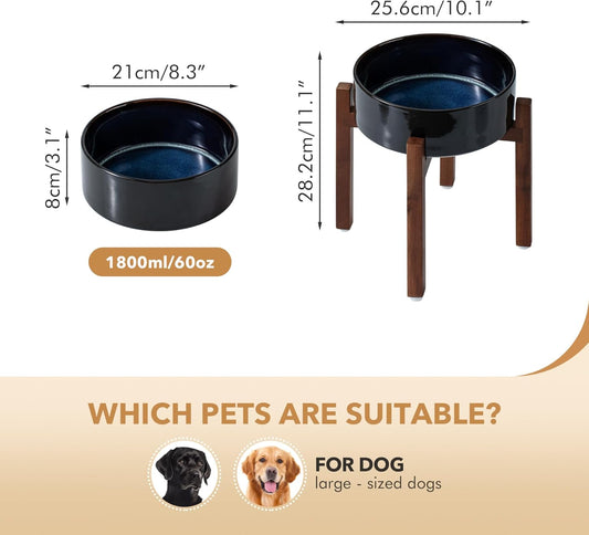Ceramic 8.2inch Raised Dog Bowl Set, Elevated with Acacia Wood Stand, Food and Water Bowl for Large Breed Dogs, Weighted Pet Dishes(60oz, Starry Sky)
