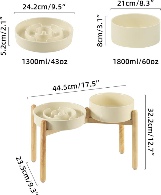Ceramic Raised Slow Feeder Dog Bowl Set, Elevated 8.2inch Bowl and 9.5inch Slow Pet Food Dish with Wooden Stand for Large Dog (2 x Beige+ Stand)