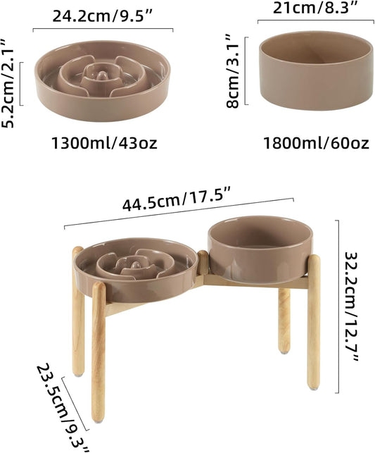 Ceramic Raised Slow Feeder Dog Bowl Set, Elevated 8.2inch Bowl and 9.5inch Slow Pet Food Dish with Wooden Stand for Large Dog (2 x Brown Coffee+ Stand)