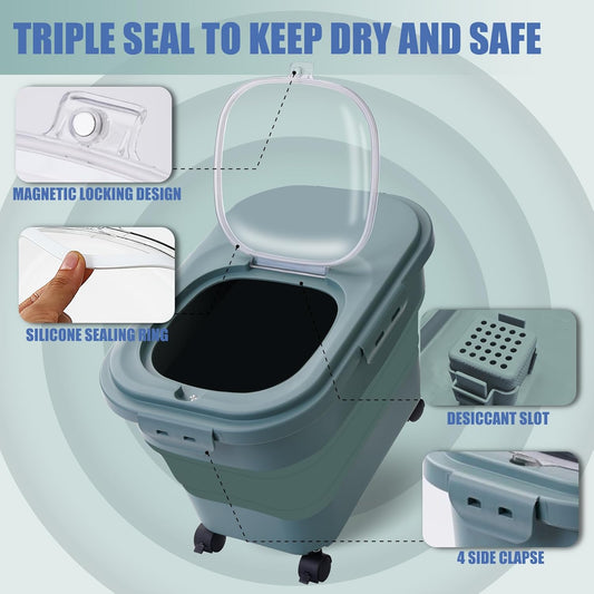 Collapsible Dog Food Storage Container with Lids, Airtight Rice Flour Cereal Sugar Cat Pet Bird Seed Containers Dispenser Bin Bucket with Rolling Wheel, 20 25 30 Lbs Plastic Sealable Kitchen Holder