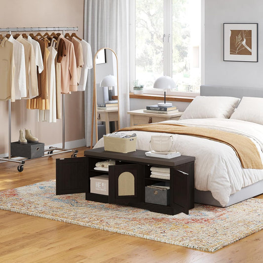 DINZI LVJ Shoe Bench, Entryway Storage Bench with Doors, Cushion, 2-Tier Shoe Rack with 8-Cubby, 47.2”L x 13.8”W Shoe Organizer Cabinet, Adjustable Shelf, Living Room, Bedroom, Espresso with Rattan
