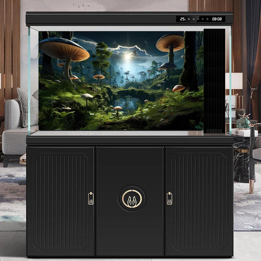 Fantasy Mushrooms Landscape Aquarium Background Tranquil Stream Cloudy Sky Terrarium Background Lush Green Tropical Plants Trees Fish Tank Backdrop Decoration Tank Background Poster 48x18in