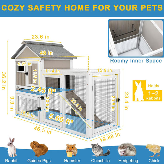 48" L Rabbit Hutch Outdoor Indoor Bunny Hutch Weatherproof, 2-Story Wood Rabbit Cage with Deep Tray, Chew-Resistant Ramp, UV Roof, Bunny House for Small Animal, Expandable Guinea Pig Cage