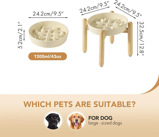 9.5inch Ceramic Dog Raised Slow Feeder Set, Elevated Bowl with Wooden Stand for Large Dog, Slow Feeder Dish for Fast Easters, Anti-Gulping(Beige, Single Bowl+ Stand)