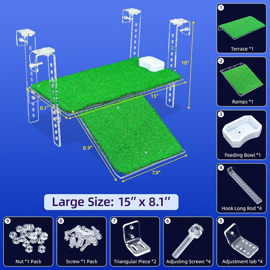 Adjustable Hanging Turtle Dock with Anti-Slip Artificial Grass Basking Platform Sturdy Acrylic Ramp for Aquatic Turtles, Compatible with Various Tank Sizes, Easy Setup Transparent, 15 Inch