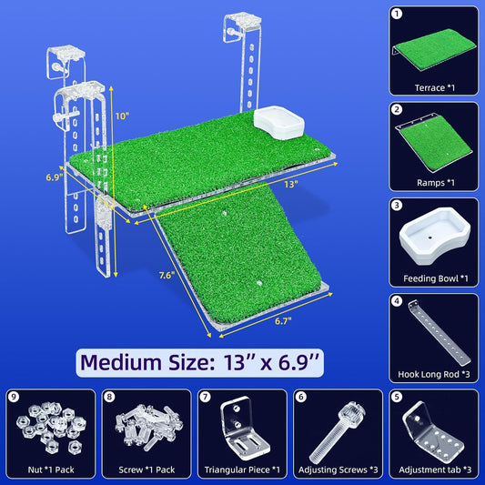 Adjustable Hanging Turtle Dock with Anti-Slip Artificial Grass Basking Platform Sturdy Acrylic Ramp for Aquatic Turtles, Compatible with Various Tank Sizes, Easy Setup Transparent, 13x6.9 Inch