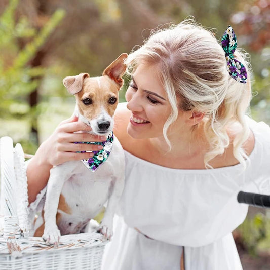 E-Clover Dog Bandanas & Matching Scrunchie Set Dog Bandana Scarf Bibs Washable Kerchief for Small Dogs Puppy & Pet Owner Purple Halloween Accessories