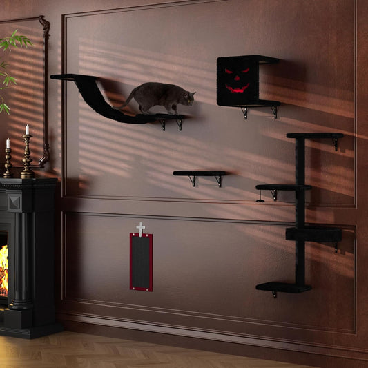 NUNU LAB Cat Wall Shelves, 6 Pcs Luxury Wall-Mounted Cat Climber Set, Indoor Cat Furniture with 1 Condos House, 2 Cat Wall Shelves, 1 Scratching, 1 Bridge Ladder, 1 Scratching Pad, Black