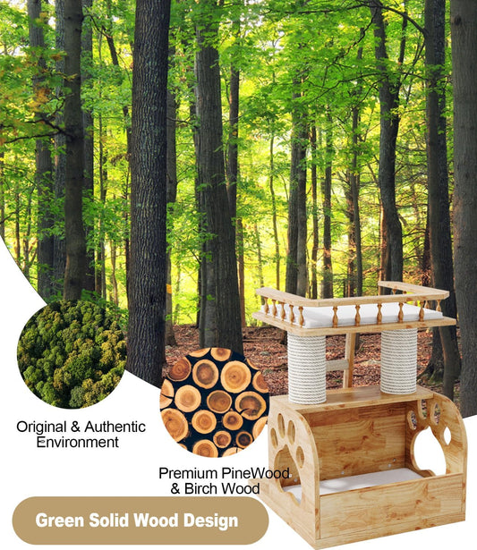 Modern Cat Tree, Solid Wooden Cats Tower, 37" Luxury Cats Trees Condo for Large Cat, Multi-Level Cat Tree Tower Natural Cat House Furniture, with Scratching Posts, Removable Washable Cushions