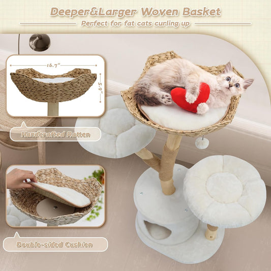 Modern Cat Tree Tower, Solid Wood Multi-Level w/ 2 Flower Perches, Scratching Post, Hanging Ball - Luxury Boho Cat Furniture w/Condo & Wicker Basket for Indoor Cats