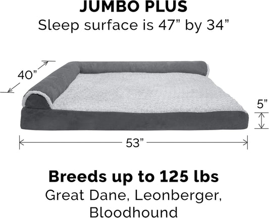 Furhaven Cooling Gel Dog Bed for Large Dogs w/ Removable Bolsters & Washable Cover, For Dogs Up to 125 lbs - Two-Tone Plush Faux Fur & Suede L Shaped Chaise - Stone Gray, Jumbo Plus/XXL