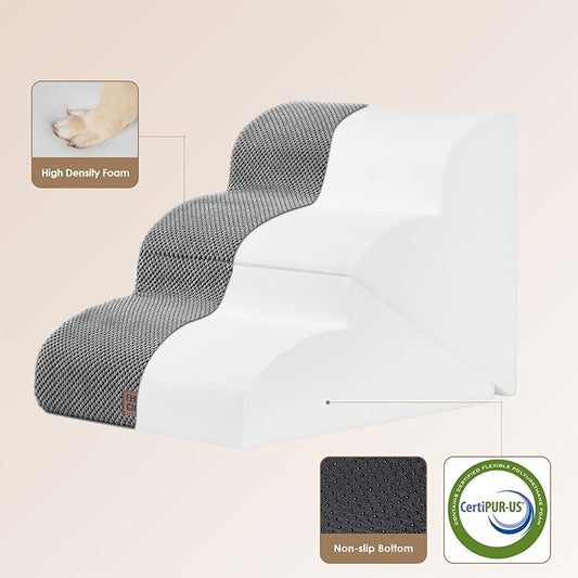 High Density Foam Dog Stairs Steps, 17.8’’ Non-Slip Extra Wide Deep Pet Steps for Beds Or Couches, for Injured or Older Pets Dogs and Cats with Joint Pain, 3-Tiers (Grey)