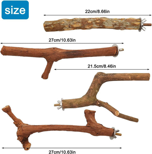 4 Pcs Natural Wooden Bird Perch Parrot Stand, 2 Grape Wood Perches, A Stand Fork Standing Branch, A Paw Grinding Fork, Bird Cage Accessories for Parakeets, Birdcage Sticks & Toys for Budgies, Finches