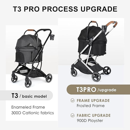T3 Pro 3-in-1 Small Pet Stroller for Dog & Cats, 4 Wheels with Detachable Carrier with Pad, Canopy and Cup Holder (Black)
