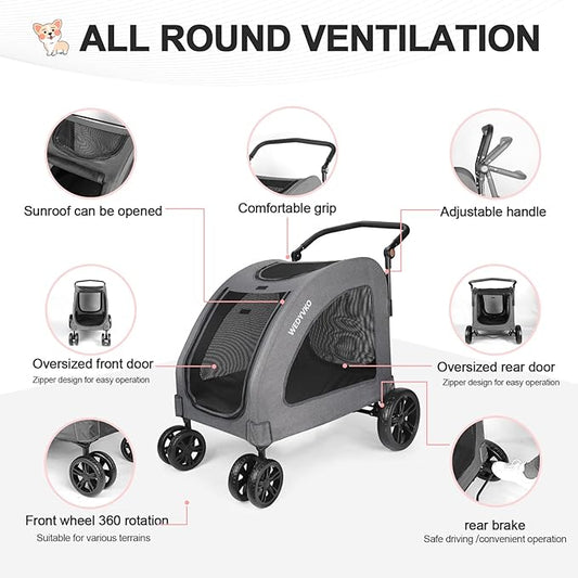 EchoSmile XL Extra Large Dog Stroller - Adjustable Handles,Lightweight Folding Pet Stroller,All-Terrain 4 Wheel for 2 Medium Dogs,Dual Entry Safety Dog Stroller,Capacity 160 lbs,Gray