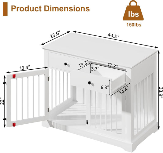 PUKAMI 44inch Dog Crate Furniture with Drawers,Wooden Dog Kennel Furniture for Large Breed,White End Table Wood Dog House for Indoor use,for Small/Medium/Large Dog