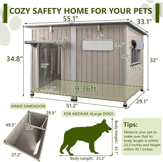 43" L Outdoor Extra Large Dog House with Removable Floor, Raised Feet, Anti-Chewing Iron Frame – Wooden Kennel with Asphalt Roof, Window for Indoor/Outdoor Use, Ideal for Medium to Large Dogs
