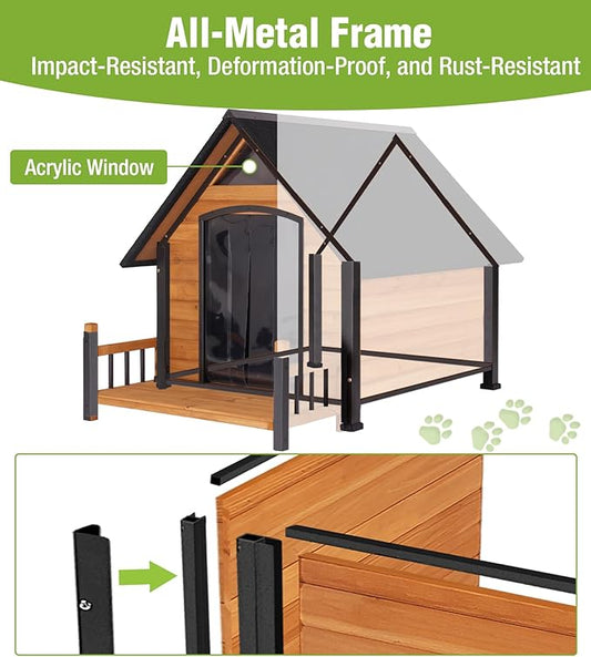 Gutinneen Large Dog House Outdoor with Strength Metal Frame, Outside Dog House with Waterproof Roof, PVC Curtain, Fir Wood Patio, Design for Small & Medium & Large Dogs