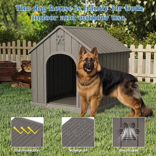 Large Dog House Outdoor Indoor for Medium Large Dogs, Durable Plastic Waterproof Doghouse with Air Vents and Elevated Floor, Easy Clean and Assemble (Grey, 36.2''L×38''W×38''H)