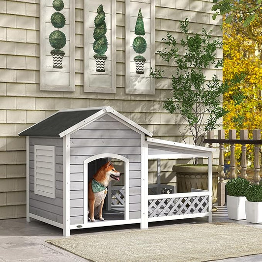 GUTINNEEN Dog House Outdoor Weatherproof with Porch, Puppy Shelter Indoor with Anti-Bite Design, PVC Curtain, Asphalt Roof, Elevated Waterproof Base, for Small to Medium Dogs - Grey