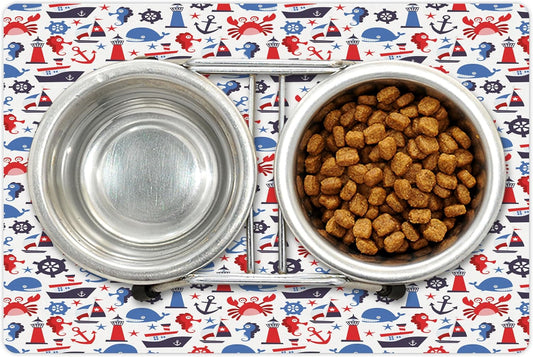 Lunarable Nautical Pet Mat for Food and Water, Steering Wheel Crab Cartoon Style Happy Fun Art Underwater World, Non-Slip Rubber Mat for Dogs and Cats, 18" X 12", Indigo Blue