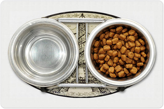 Lunarable Paris Pet Mat for Food and Water, Vintage Wall Sign with Paris Theme Famous Landmark Tourism Travel Destination, Non-Slip Rubber Mat for Dogs and Cats, 18" X 12", Beige and Black