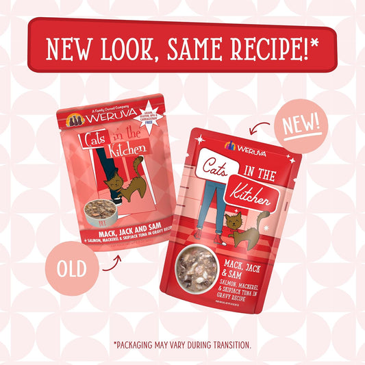 Weruva Cats in The Kitchen Mack, Jack & Sam with Mackerel, Skipjack & Salmon in Gravy Cat Food, 3oz Pouch (Pack of 12)