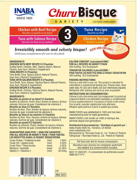 INABA Churu Bisque for Cats, Creamy Lickable Purée Side Dish with Vitamin E, 1.4 Ounces per Pouch, 12 Pouches, Tuna & Chicken Variety