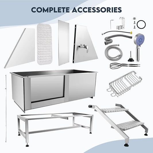 Dog Bathtub XL Professional 62inch Dog Washing Station Stainless Steel Pet Grooming Tub for Extra Large Dogs Wash Tub, Medium, Small Dogs Cats with Left Sliding Doors, Steps, Right Faucets