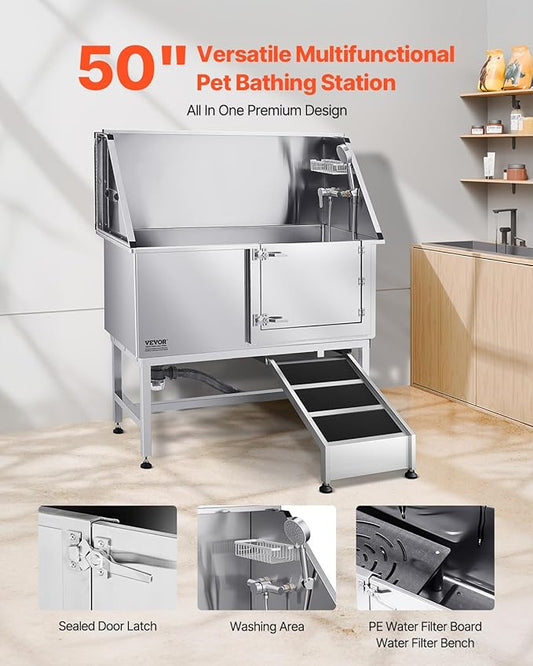 VEVOR Stainless Steel Dog Washing Station, Professional 50 inch Pet Grooming Tub w/Stairs, PE Water Filter Board, Faucet & Showerhead & Soap Holder Bathtub for Large & Medium & Small Pets (Left Door)