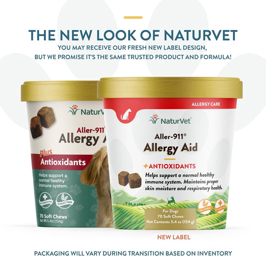 NaturVet Aller-911 Advanced Allergy Aid for Dogs, Cats – Antioxidant-Rich Pet Supplement with Omegas, DHA, EPA – Helps Support Dog Immune System, Cat Respiratory Health, Skin Moisture 70 Soft Chews