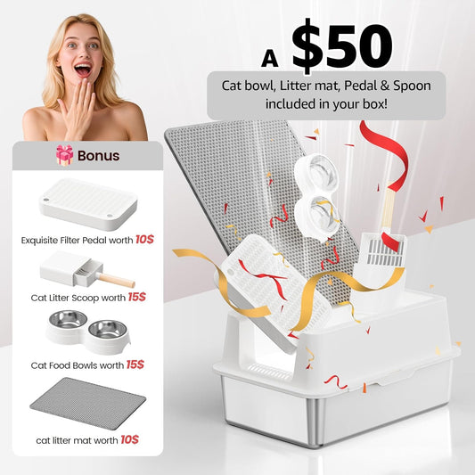 Stainless Steel Cat Litter Box - Enclosed XL Metal Kitty Litter Box with Lid for Big Cats, High Sided, Anti-Leakage, Easy Cleaning, Non-Sticky, Included Litter Mat, Cat Bowl & Spoon