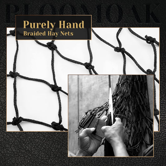 Bloomoak Slow Hay Net Feeder for Horses, Durable Soft Black PE 2/3 String Hay Bales Bags, Fit 36x18x18 to 47x25x17 Inches, Extends 50-64 Inches (3 1.6" Hole/1PC)