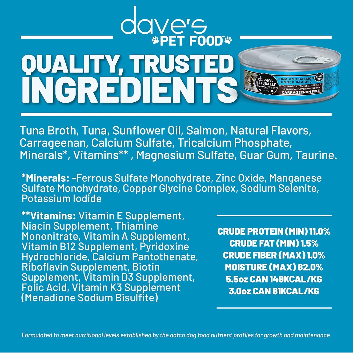 - ADDED VITAMINS & MINERALS. With flavor and nutrition at the forefront, your cat will love the taste of Dave’s nutrient-dense recipe.