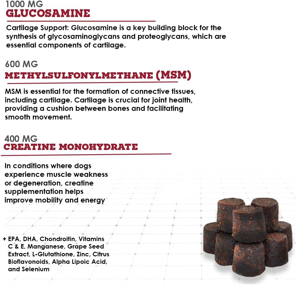Triple Strength Hypo-Allergenic Soft Chews for Dogs - Hip and Joint Support Supplement with Glucosamine, Chondroitin, & MSM - Made in The USA - 120 Soft Chews