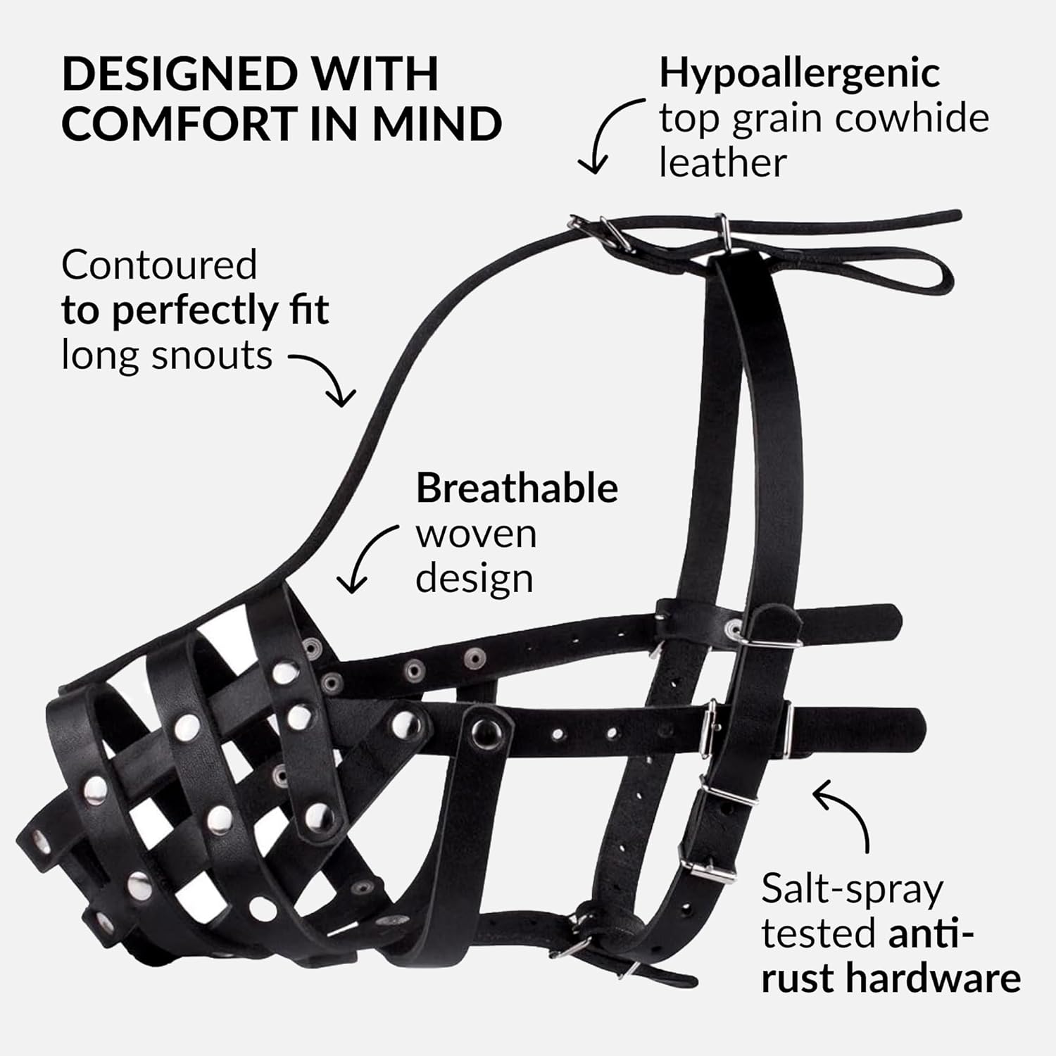 - COMFORTABLE: Our high-quality, handmade leather dog muzzle is skin-friendly. With a cross-weave design, this breathable, durable muzzle is soft on your dog’s fur because your pet’s comfort always comes first.