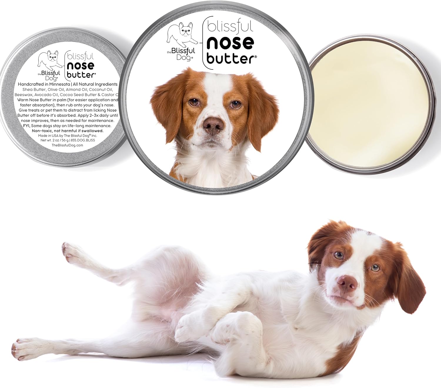 The Blissful Dog Brittany Spaniel Nose Butter for Dry, Cracked Skin, Lick-Safe Dog Nose Balm with Moisturizing Shea Butter, Almond, Olive, and Essential Oils, Pet Supplies, Uncented, 8 oz.