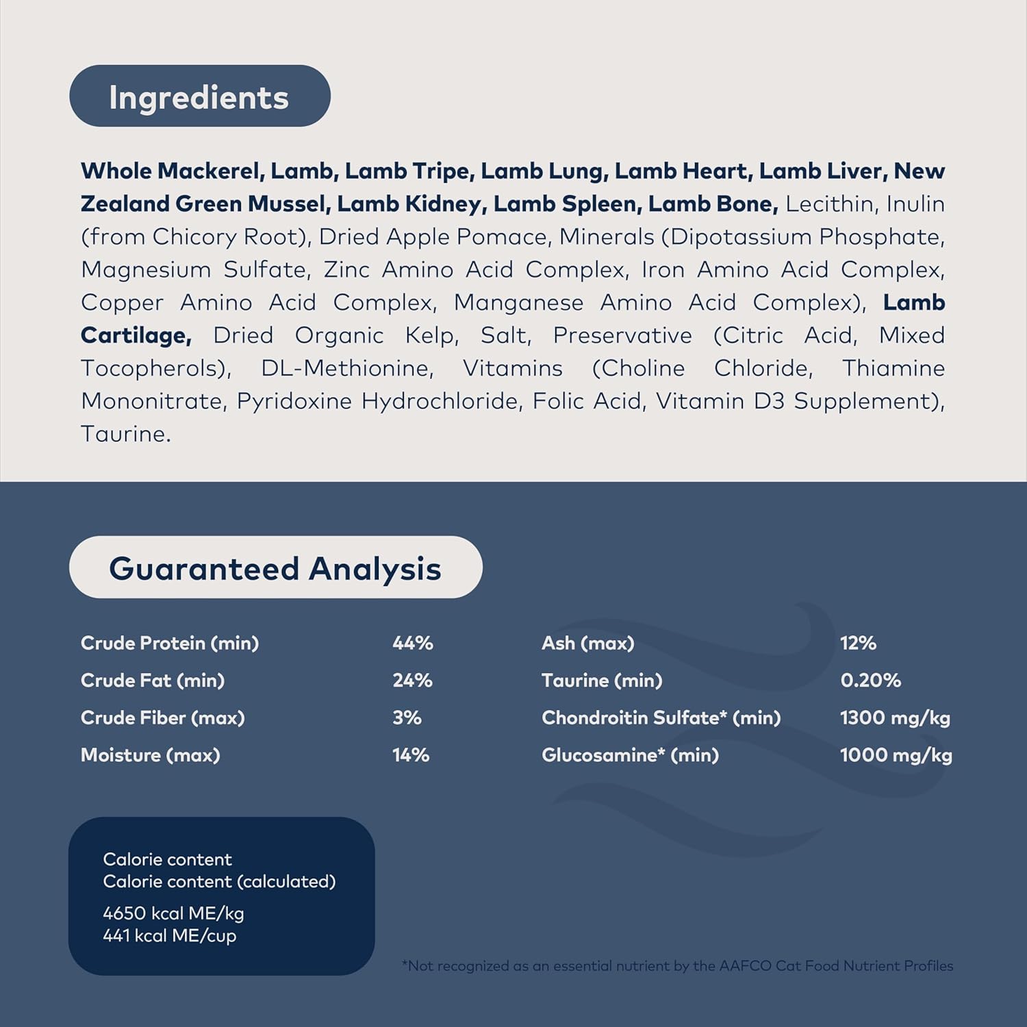 - HIGH PROTEIN, NUTRIENT DENSE: Featuring 96% wild-caught Mackerel, free-range Lamb, Organs, Bone, and New Zealand Green Mussels, this grain-free cat food delivers nutrition with a mouth-watering taste for all cats. Gentle air dried processing retains the goodness of the raw ingredients. This food supports indoor cat food needs and is perfect for all life stages, from kitten food to senior cats.