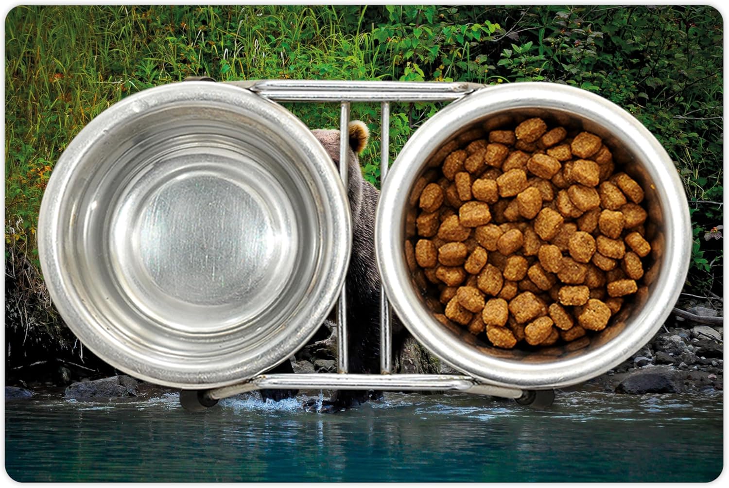 Lunarable Cabin Pet Mat for Food and Water, Grizzly Brown Bear in Lake Alaska Untouched Forest Jungle Wildlife Image, Non-Slip Rubber Mat for Dogs and Cats, 18" X 12", Brown Green