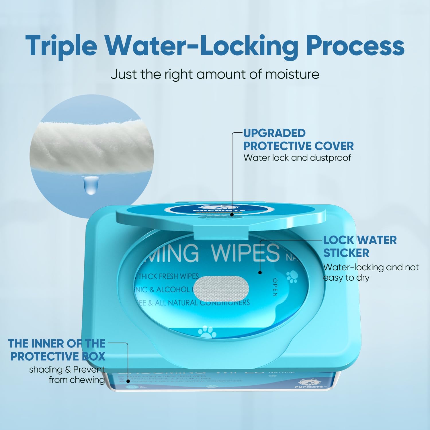 - DELICATE AND EFFICIENT CLEANSING: At PUPMATE, These grooming wipes for dogs & cats, and puppies wipes go beyond cleaning – they embody our commitment to creating a happier, healthier life for pets. Whether it's ridding them of dirt, mud, or a weird smell, our pet wipes work diligently to cleanse their butt, eyes, ears, and paws, ensuring that their four-legged friend feels consistently clean and delightfully refreshed