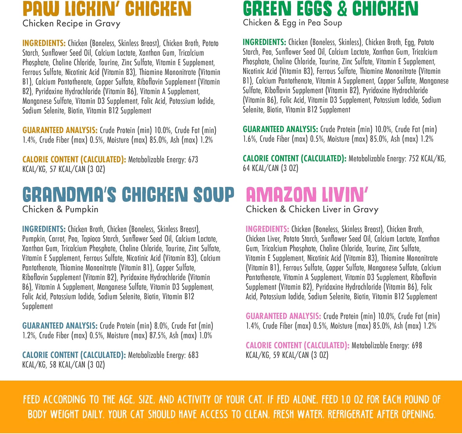 - Variety Pack includes 6 cans of each: Paw Lickin’ Chicken, Green Eggs & Chicken, Grandma’s Chicken Soup and Nine Liver.