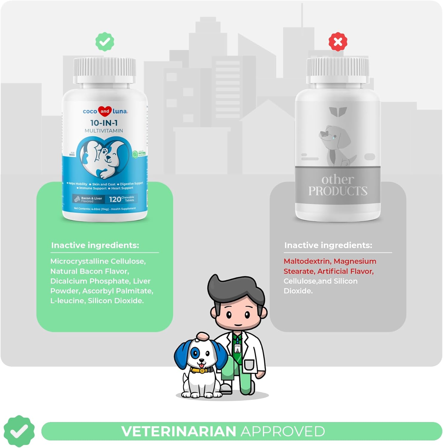 10 in 1 Multivitamin for Dogs - 120 Chewable Tablets with Glucosamine and Chondroitin - Fish Oil & Vitamins with Coq10 for Skin & Heart Health, Gut & Immune Support