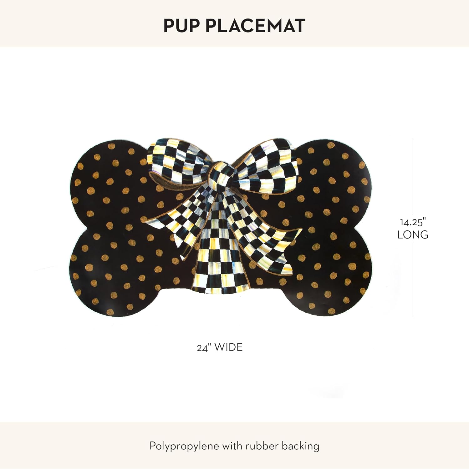 - ELEGANT PET ESSENTIAL: Set up a fashionable feeding-dispenser area with the Courtly Bow pet mat for dog bowls or cat bowls! It is bedecked with gold dots on stylish black and topped off with an oversized Courtly Check ribbon.