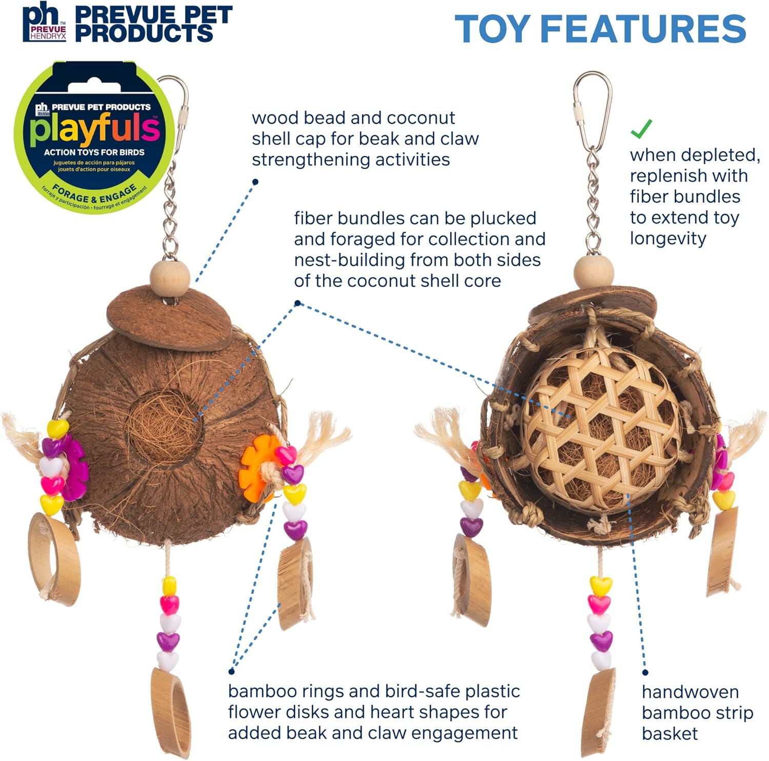 - This bird-safe toy is made using a quick-link, stainless steel wire, sea grass rope, woode, beads and bamboo.